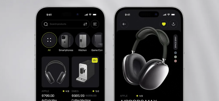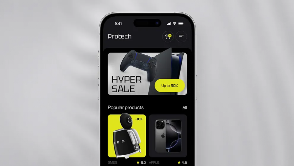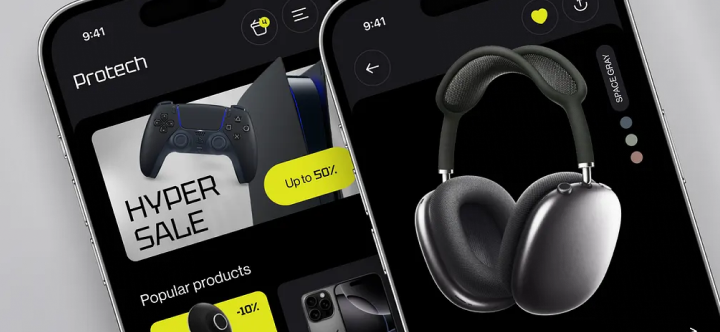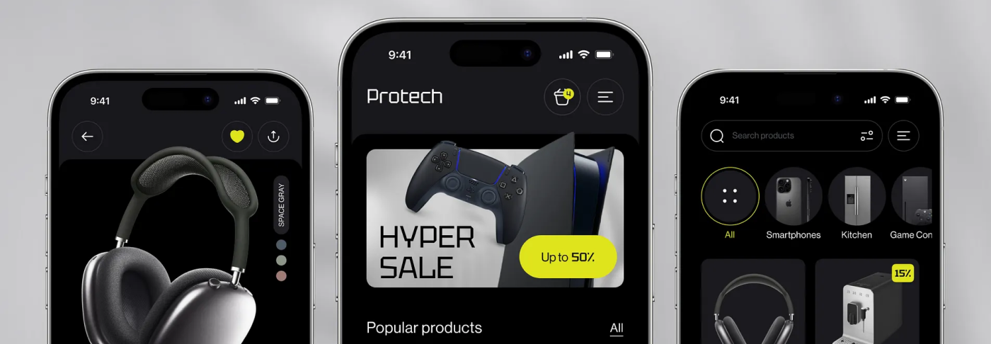The design team adopted a dark-themed interface accented with bright yellow highlights, conveying a sense of technological sophistication and premium quality. The main screen showcases popular products, accompanied by a navigational menu and promotional banners. A catalog screen offers category selections and filters, while the product screen provides detailed information and high-quality images. Development focused on ensuring responsiveness and smooth navigation across various devices, enhancing user engagement and satisfaction.